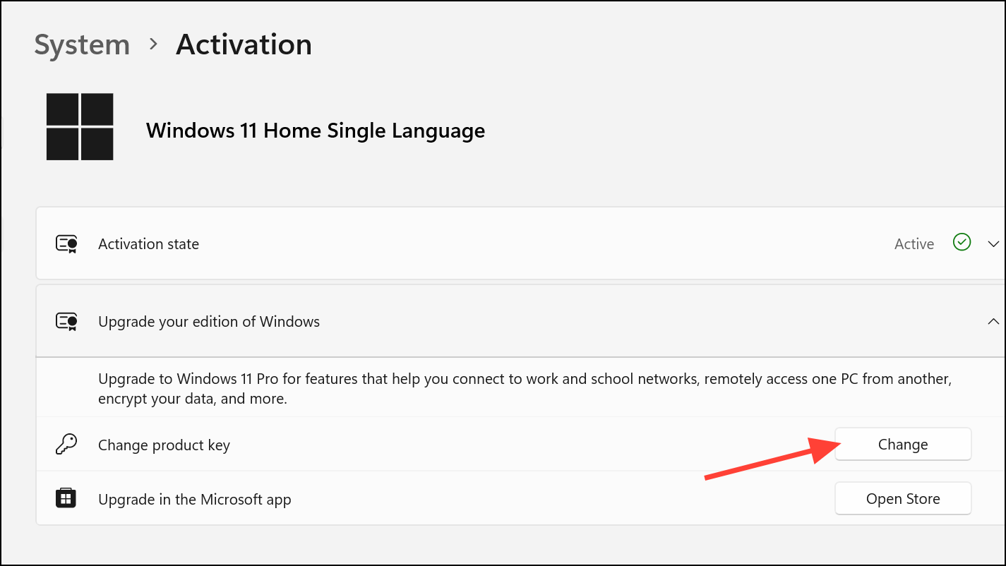 Крок 2:Якщо відображається ключ продукту, введіть його вChange product keyрозділ у налаштуваннях активації. Якщо ключ не відображається, ваша система, ймовірно, не має ключа, вбудованого в BIOS.