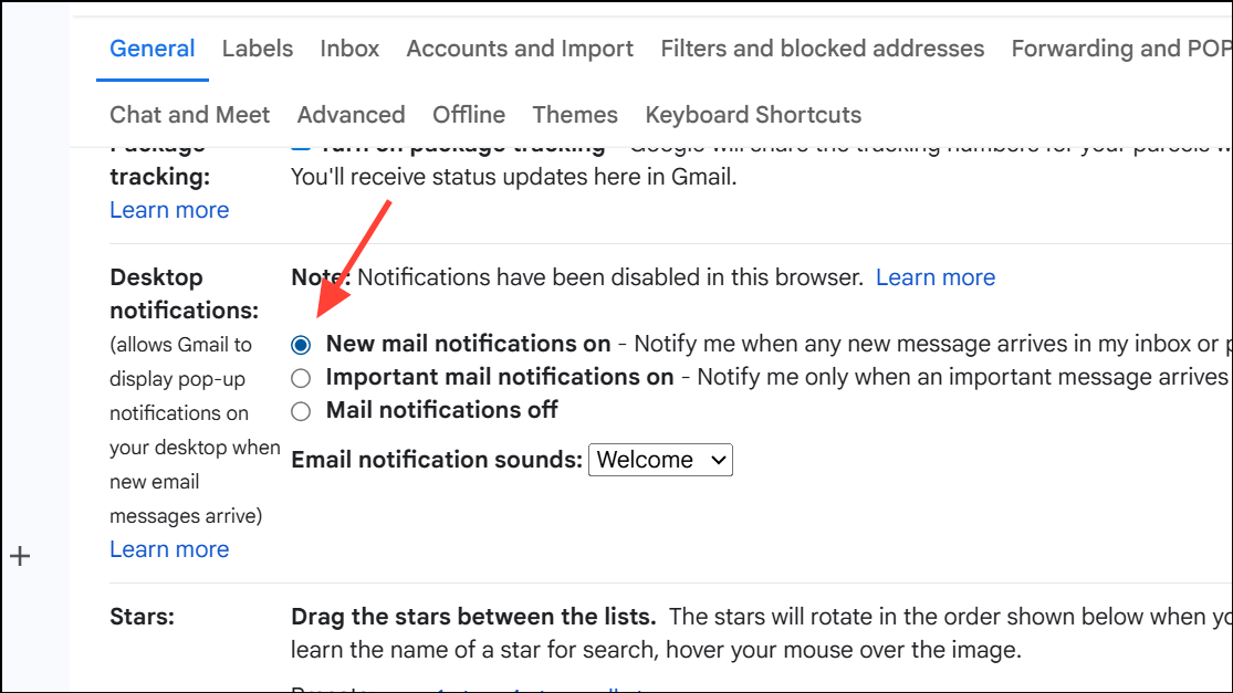 Крок 2:Знайдіть розділ сповіщень або сповіщень на робочому столі. Для Gmail це зазвичай меншеНалаштування > Переглянути всі налаштування > Сповіщення на робочому столі. ПереконайтесьСповіщення про нову пошту ввімкненоабо вибрано подібний параметр, потім збережіть зміни.