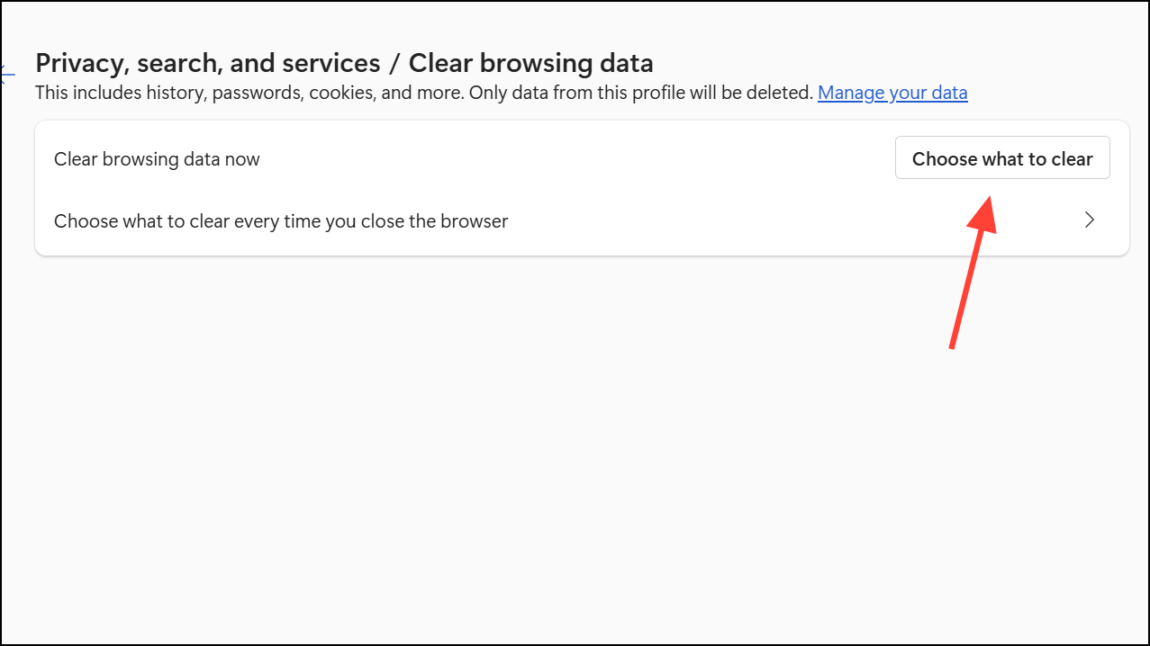Крок 1:У Edge перейдіть доНалаштування > Конфіденційність, пошук і служби, а потім натиснітьВиберіть, що очиститипідОчистити дані веб-перегляду.