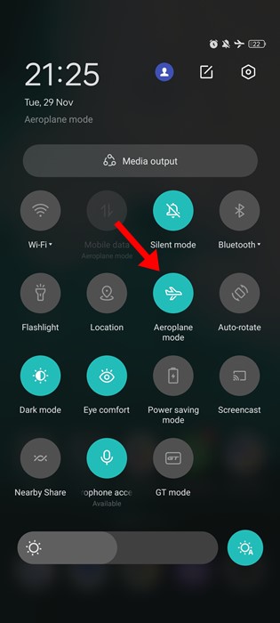 Щоб увімкнути режим польоту, потрібно опустити затвор сповіщень і торкнутися «Режим польоту» або «Режим польоту». Після ввімкнення зачекайте кілька секунд і вимкніть режим польоту.