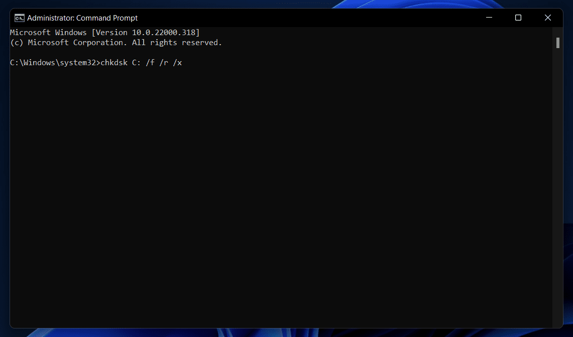 - вкомандний рядок,типуchkdsk C: /f /r /xа потім ударивВведітьдля виконання програми.
