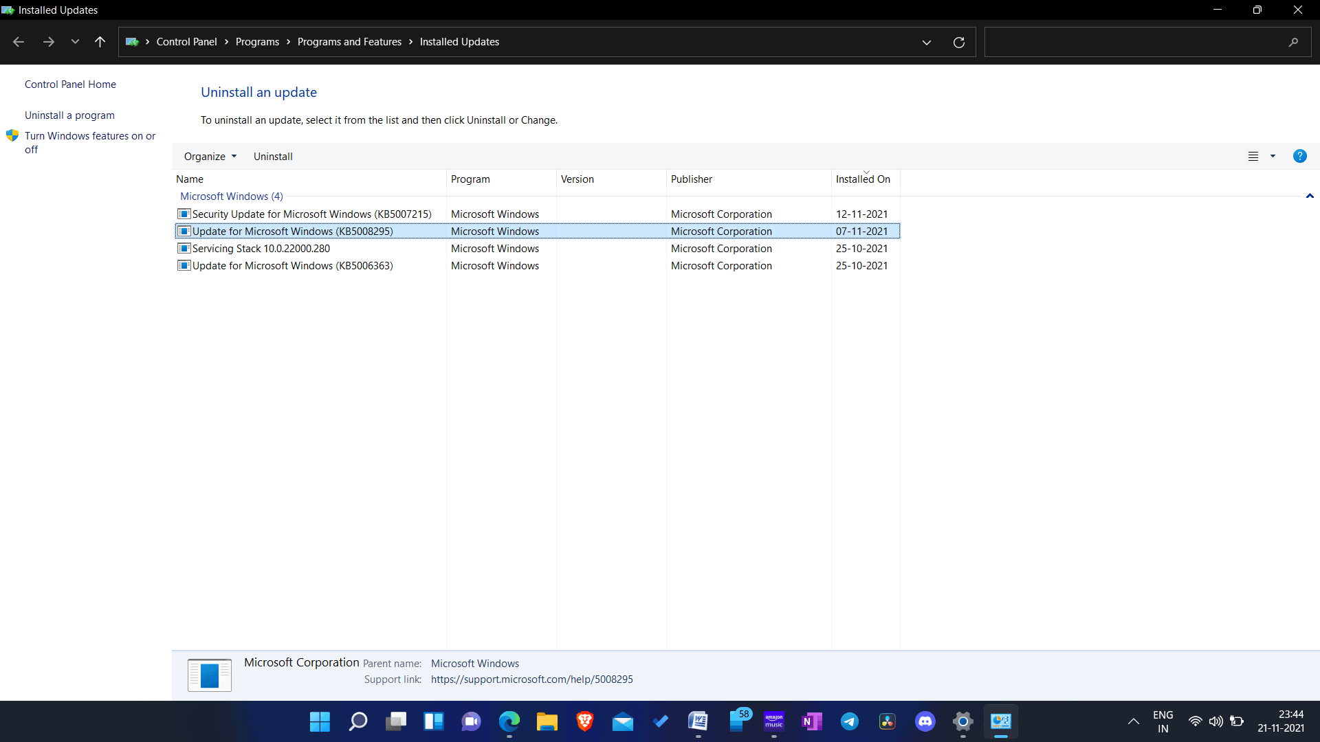 - Виберіть нещодавно встановлене оновлення на наступній сторінці, а потім натиснітьВидалитищоб видалити нещодавно встановлені оновлення.