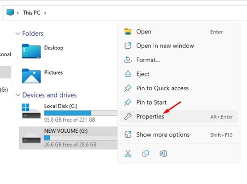 1. Відкрийте Провідник файлів і клацніть правою кнопкою миші на Pendrive. У контекстному меню виберітьВластивості.
