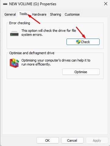 Windows має вбудовану утиліту перевірки помилок, яка може виправити більшість помилок, пов’язаних з USB. Щоб виправити помилку, ми скористаємося утилітою перевірки помилок.