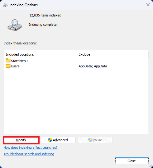 • ВідкрийтеМеню Пускнатисканнямвікнаключ. Тут знайдітьПараметри індексування; натисніть на першу опцію, яка з’явиться, щоб відкрити її.