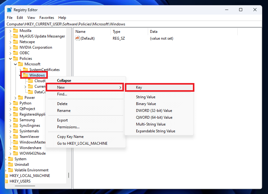 • ComputerHKEY_CURRENT_USERSoftwarePoliciesMicrosoftWindows