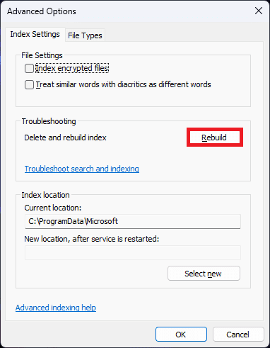 • вДодаткові параметривікно, натисніть наПеребудуватищоб перебудувати пошуковий індекс.