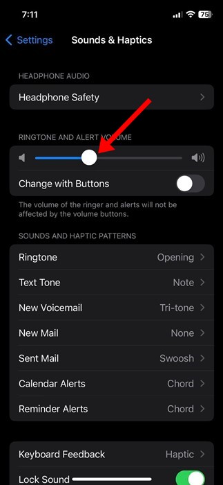 2. У розділі «Звуки та тактильні відчуття» прокрутіть униз доГучність мелодії та оповіщення.