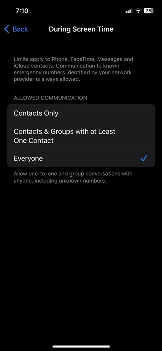 3. У полі «Обмеження зв’язку» торкнітьсяПід час екранного часуваріант.