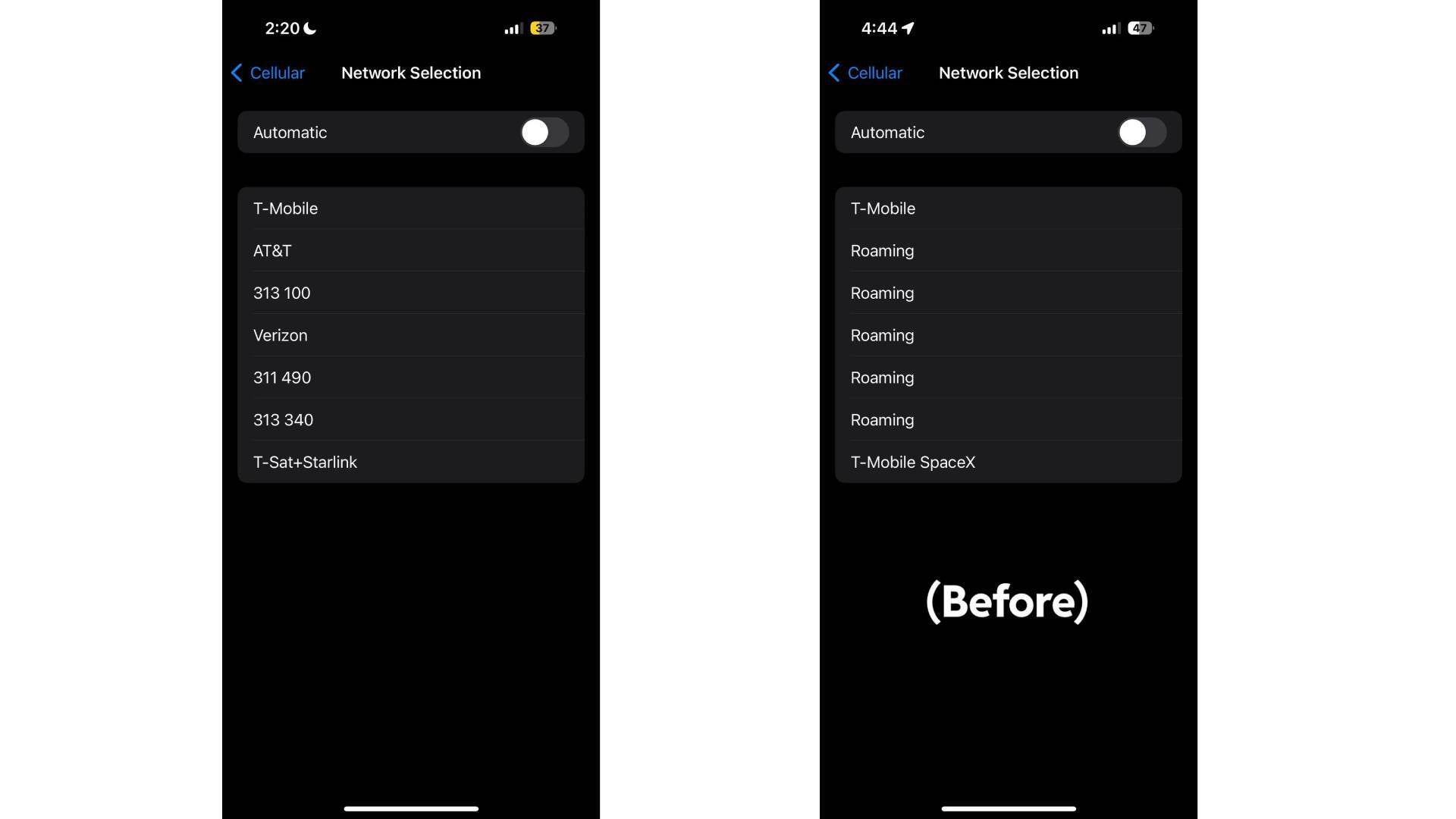 Ще одна зміна, яка тепер краще відображається в меню вибору мережі, полягає в тому, що послуга T-Satellite на основі Starlink тепер називається «T-Sat+Starlink» у налаштуваннях. До цього він був відомий як "T-MobileSpaceX».T-Mobileпочав називати службу T-Satellite відносно недавно, і, ймовірно, хоче уникнути плутанини, також перейменувавши службу в налаштуваннях.