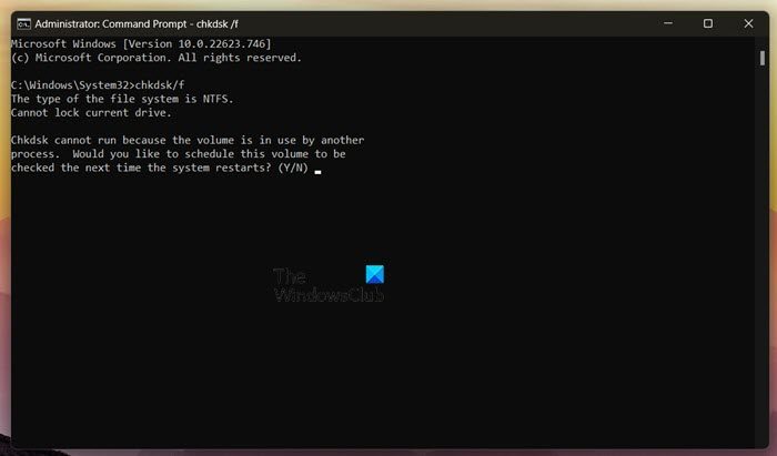 - Команда не запускається, оскільки використовується кореневий диск вашого пристрою. Однак під час перезавантаження комп’ютера вам буде запропоновано почати сканування.